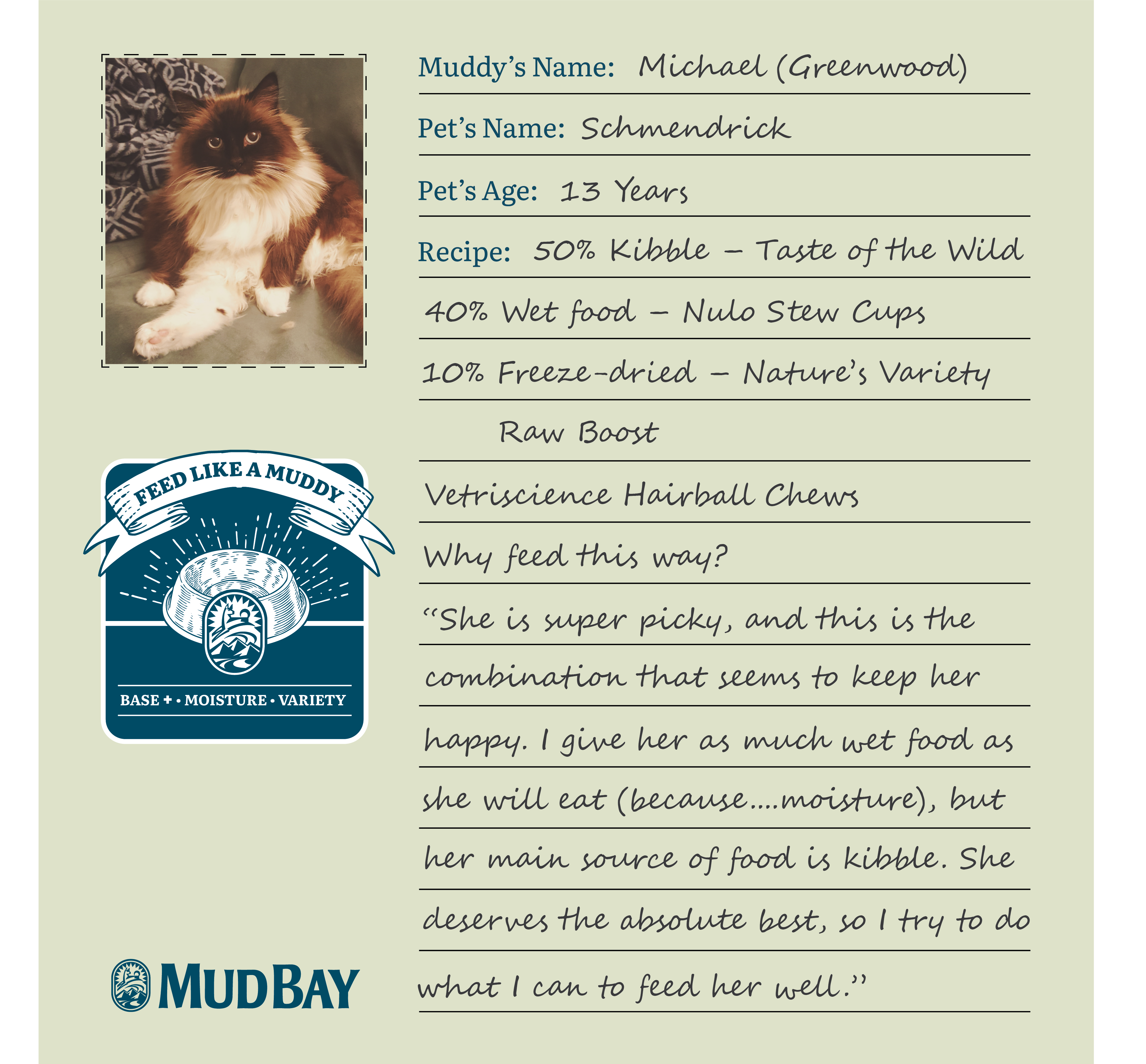 To see how adding more variety might work for your cat, take a look at these three example of cat feeding plans from actual Muddies.